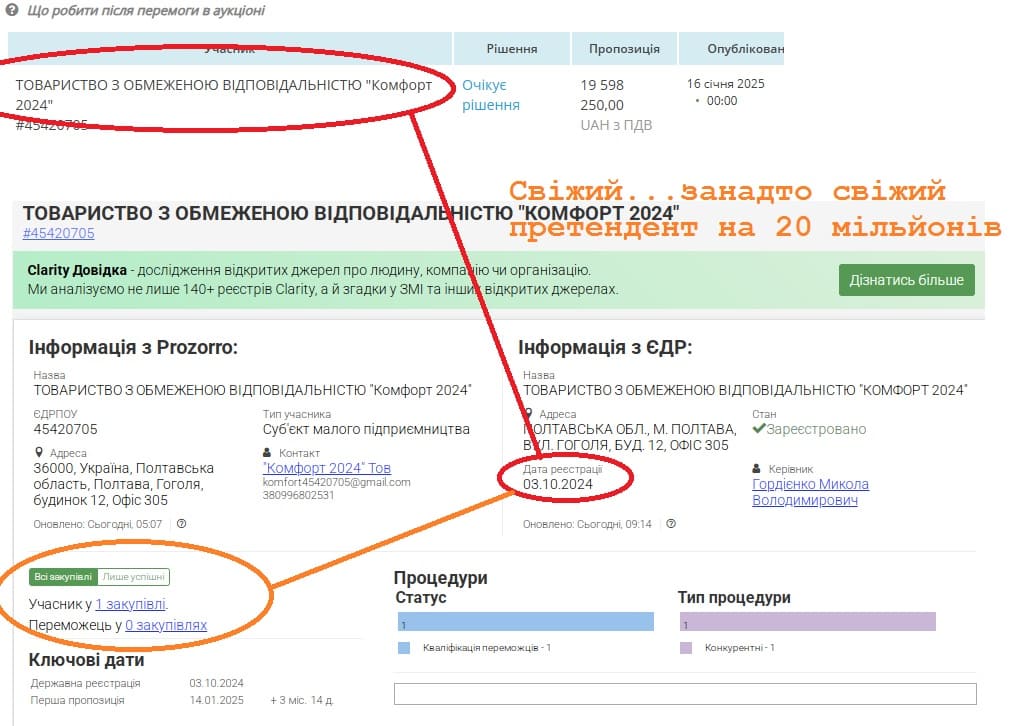 Саме так, ТОВ “Комфорт 2024” було засновано 3 жовтня 2024 року. І тут така дивна річ трапилась: тримісячна контора виходить на свої перші торги під 20 мільйонів і відразу виграє.