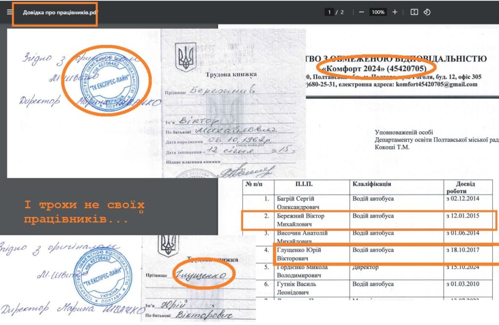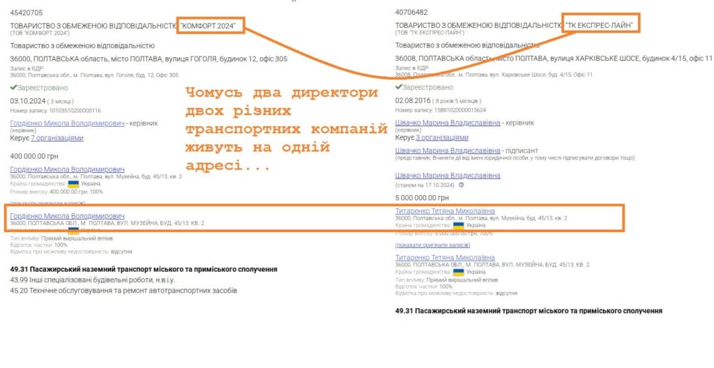 Пані Титаренко вказана, як засновник ТОВу “ТК ЕКСПРЕС-ЛАЙН”. ТОВ, за дивним збігом обставин, також займається “пасажирськими перевезеннями” і також має контракти в Департаменту освіти Полтавської міської ради.