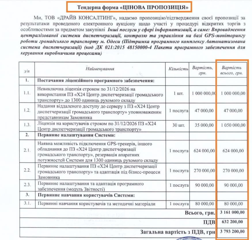 9 грудня ДЕПАРТАМЕНТ ТРАНСПОРТУ, ЗВ’ЯЗКУ ТА ОРГАНІЗАЦІЇ ДОРОЖНЬОГО РУХУ ОДЕСЬКОЇ МІСЬКОЇ РАДИ провів закупівлю на впровадження централізованої системи диспетчеризації, контролю та управління на базі GPS-моніторингу роботи громадського транспорту м. Одеси (Підтримка програмного комплексу Автоматизована система диспетчеризації). Очікувана вартість закупівлі склала 3 888 904 гривні (місцевий бюджет).