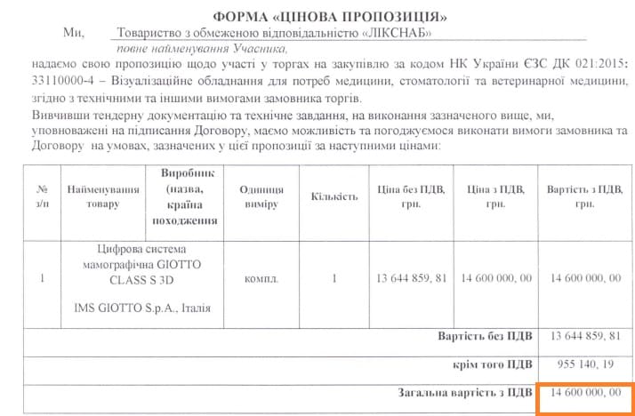 На торгах переміг єдиний учасник, ТОВ “ЛІКСНАБ”, який не знижував вартість. ТОВ пропонує модель GIOTTO CLASS S 3D (IMS GIOTTO S.p.A., Італія).