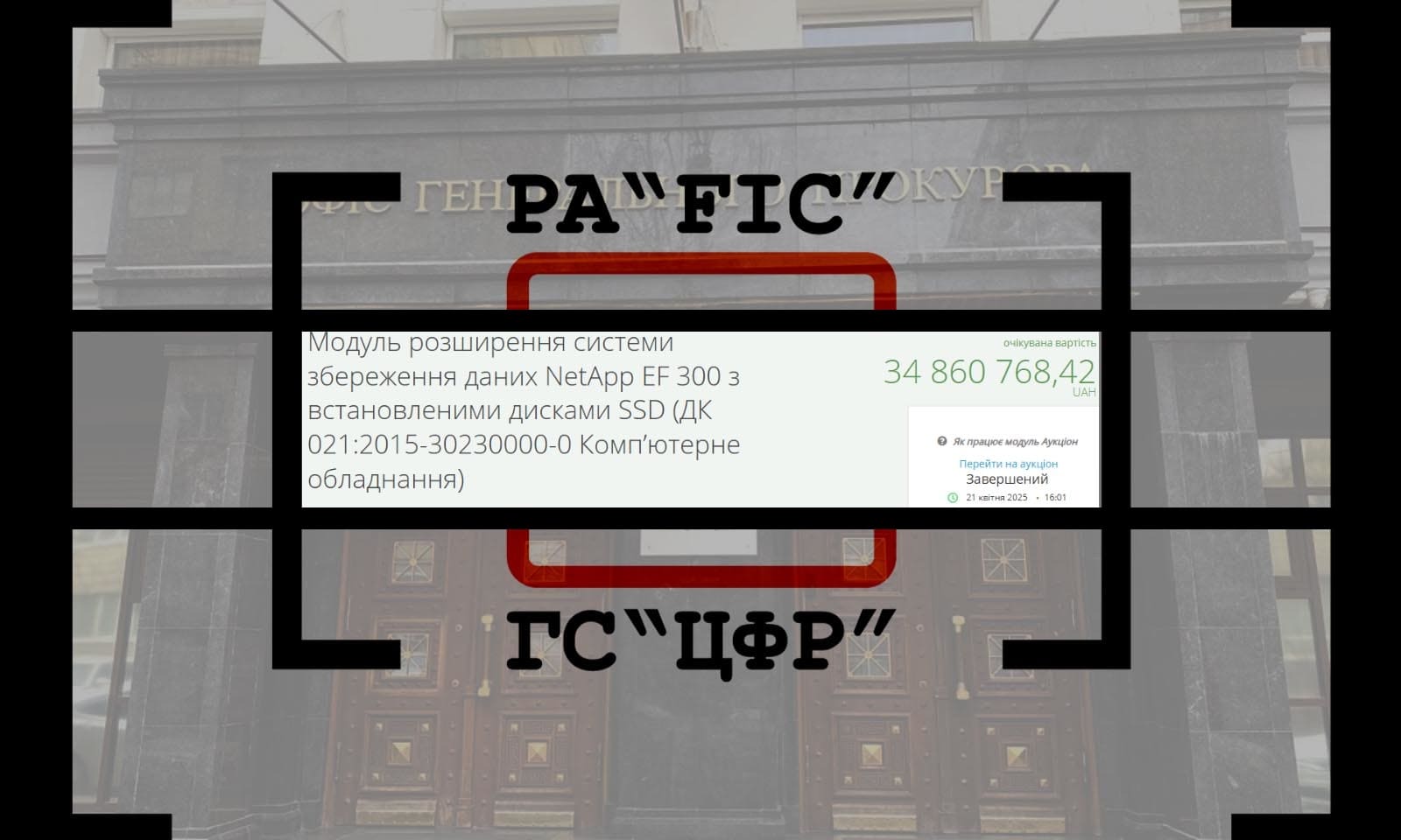 21 квітня Офіс Генерального прокурора провів закупівлю на модуль розширення системи збереження даних NetApp EF 300 з встановленими дисками SSD. Очікувана вартість закупівлі склала 34 860 768,42 гривні.