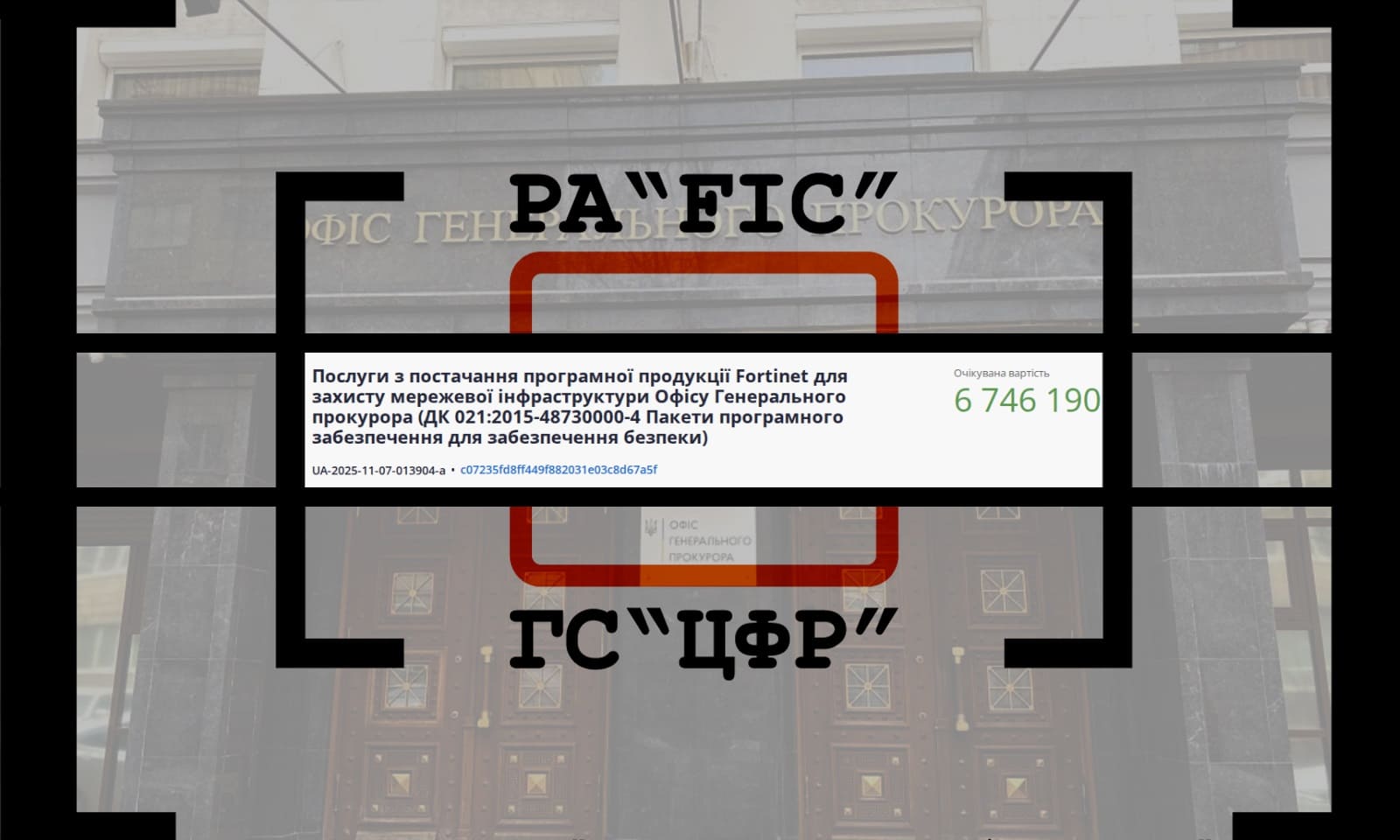 24 листопада Офіс Генерального прокурора провів закупівлю на послуги з постачання програмної продукції Fortinet для захисту мережевої інфраструктури Офісу Генерального прокурора. Очікувана вартість закупівлі склала 6 746 190 гривень.