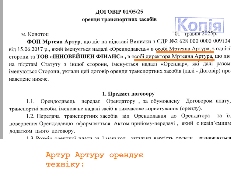 МТБ. Директор ТОВу “ІННОВЕЙШЕН ФІНАНС”, Мртеян Артур, орендує у ФОПу Мртеян Артур транспортні засоби. Ще орендує у інших ФОПів та ТОВок у Конотопі, але то вже не так феєрично, як орендувати у самого себе.