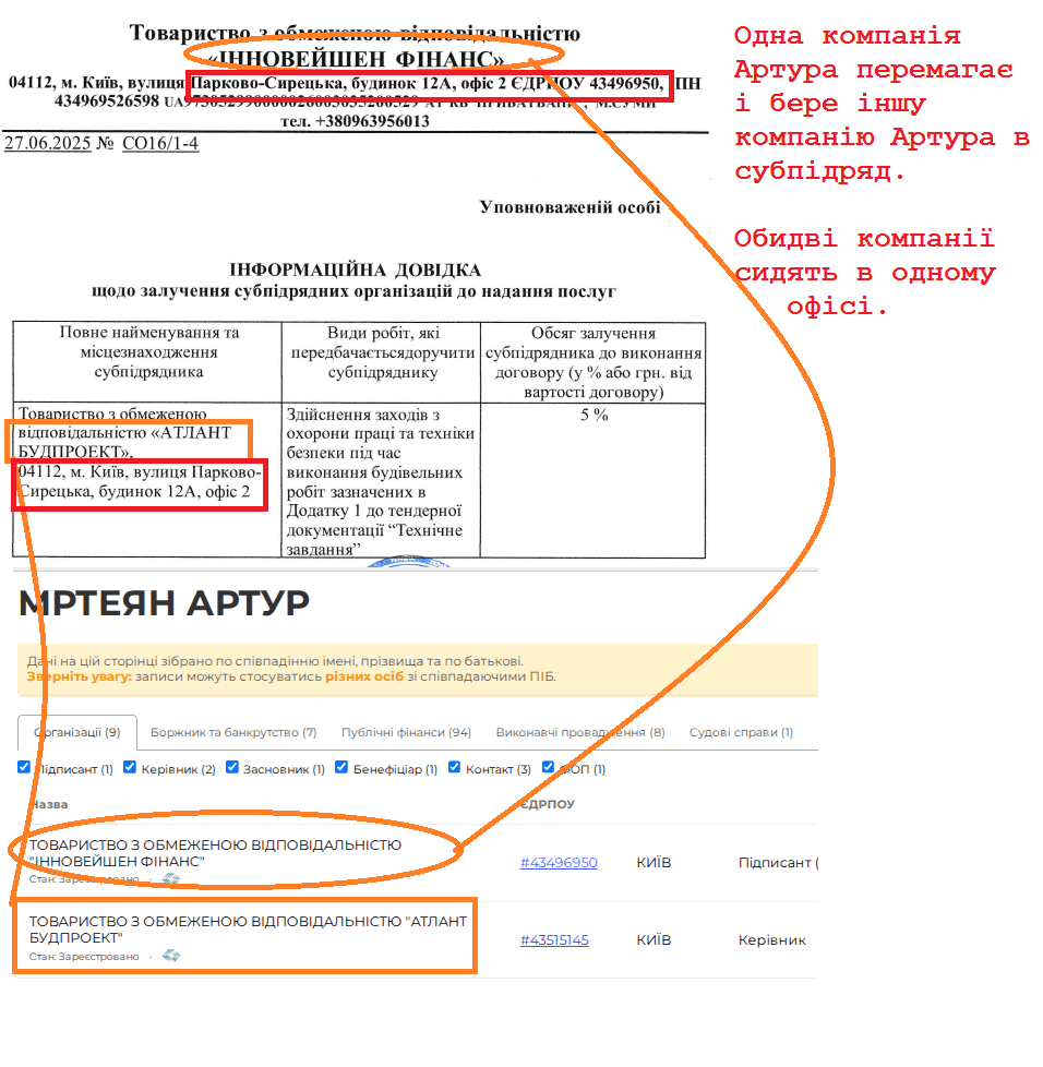 Там ще цікаво. ФОП МРТЕРЯН ЛУСІНЕ чомусь надає підтвердження, що надає техніку на цей тендер двом ТОВам: Нашому, вже названому, та ТОВу “АТЛАНТ БУДПРОЕКТ”. Таким чином ми дізнаємось, що “Інновейшен” бере в підрядники для цього тендера ТОВ “АТЛАТНТ БУДПРОЕКТ”.