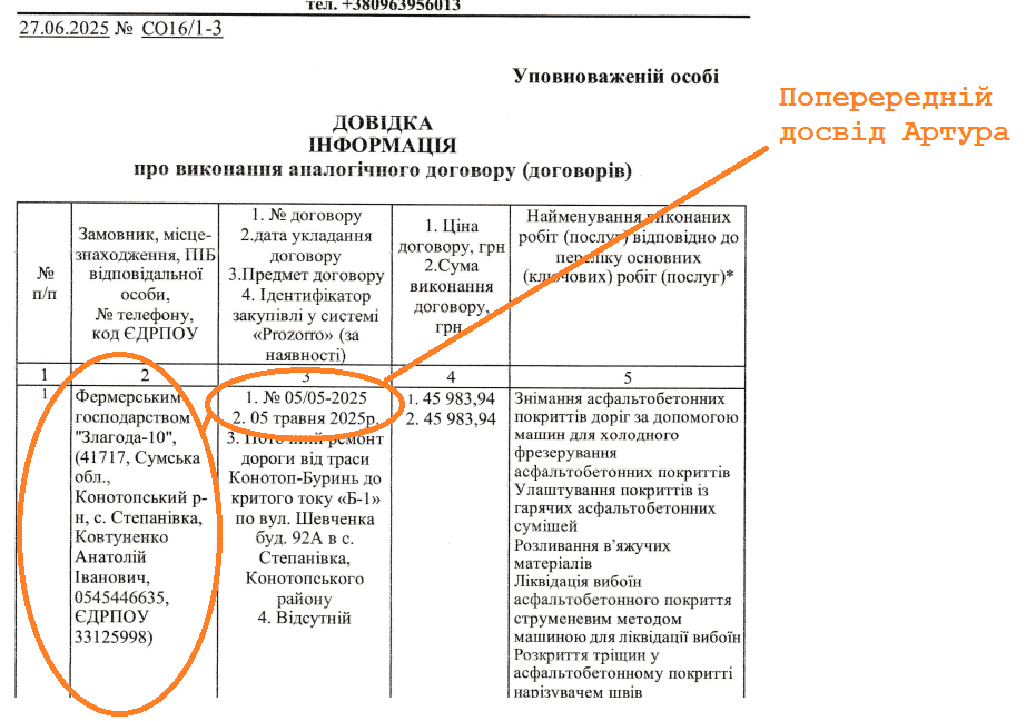 Оскільки цим не похвалишся без остаточного вердикту замовників, то в якості досвіду ТОВ додає документ, ніби ремонтував дороги на Фермерському господарстві “Злагода-10” (с. Степанівка, біля Бурині, Сумщина, 2025 рік, травень).
