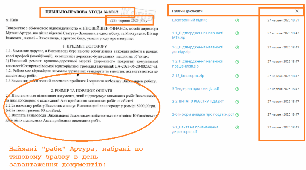 Працівники. Як ви вже зрозуміли – з штатних лише директор. Тендер відбувся 30 червня, документи підвантажені 27 червня. Саме 27 червня по цивільно-правовим угодам набрали ще 7 працівників з “фінальною винагородою”… всім по 8 000. Робота мрії: латати дороги під обстрілами за 60 кілометрів до кордону з країною “404” за винагороду у 8 тисяч гривень.