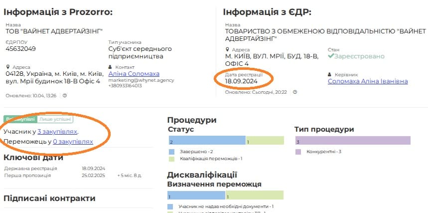 ТОВ існує з вересня 2024 року. Досі не має жодного контракту в Prozorro.