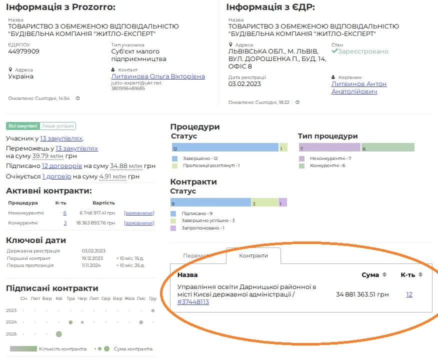 ТОВ існує з 2023 року. Знаходиться у Львові. Має 12 договорів на 34 мільйони. Всі підписані з вище згаданим замовником.