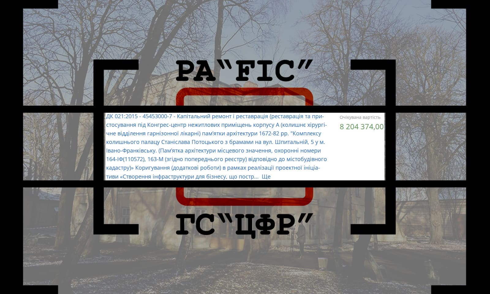 21 лютого ДЕПАРТАМЕНТ ІНВЕСТИЦІЙНОЇ ПОЛІТИКИ, ПРОЄКТІВ, МІЖНАРОДНИХ ЗВ’ЯЗКІВ, ТУРИЗМУ ТА ПРОМОЦІЙ МІСТА ІВАНО-ФРАНКІВСЬКОЇ МІСЬКОЇ РАДИ провів закупівлю на капітальний ремонт і реставрація (реставрація та пристосування під Конгрес-центр нежитлових приміщень корпусу А (колишнє хірургічне відділення гарнізонної лікарні) пам’ятки архітектури 1672-82 рр. “Комплексу колишнього палацу Станіслава Потоцького з брамами на вул. Шпитальній, 5 у м. Івано-Франківську.