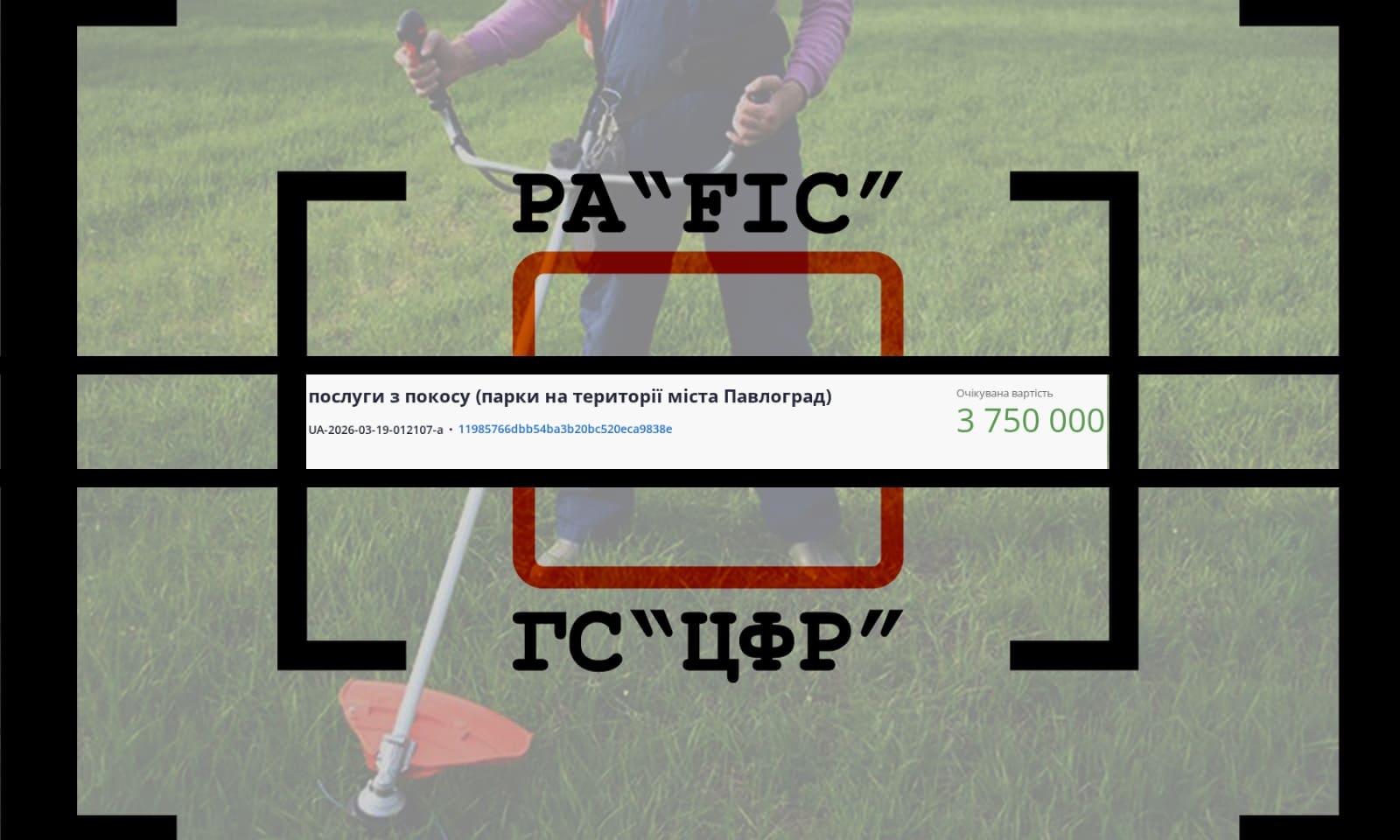 27 березня Комунальне підприємство “ЗАТИШНЕ МІСТО” ПАВЛОГРАДСЬКОЇ МІСЬКОЇ РАДИ провело закупівлю на послуги з покосу (парки на території міста Павлоград), очікуваною вартістю у 3 750 000 гривень.