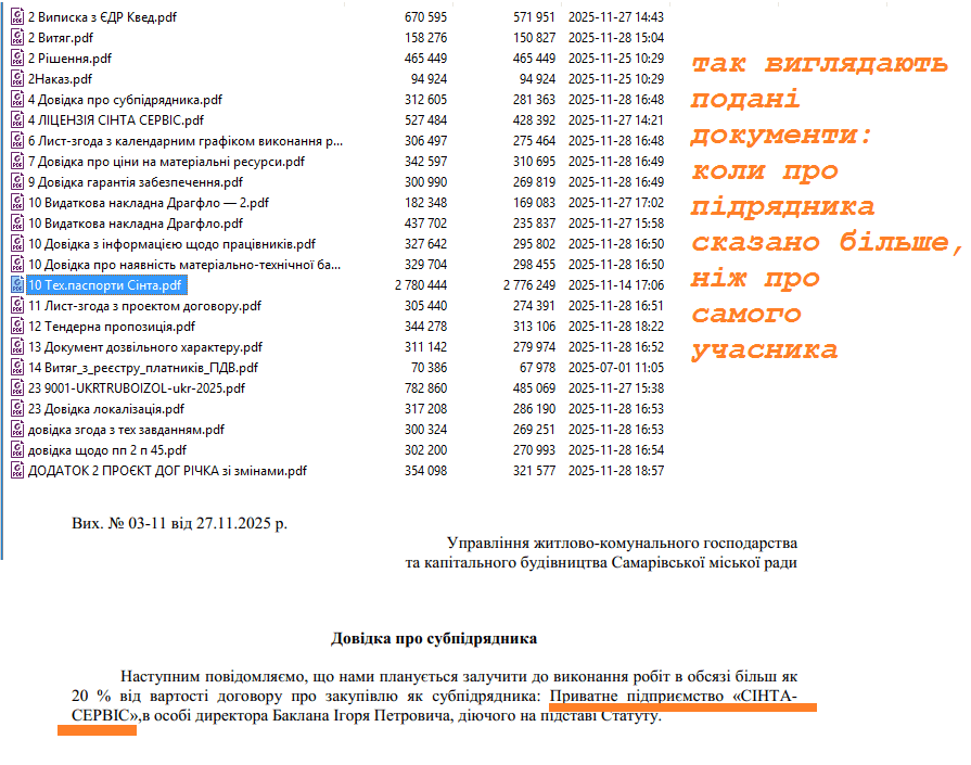 Подають документ, ніби їм допоможе субпідрядник під назвою ПП “Сінта-Сервіс”. А далі почалося… Подані документи майже нічого не говорять про переможця, зате розповідають, який класний буде субпідрядник: і досвід субпідрядника, і ліцензії, і техпаспорти. Взагалі не зрозуміло, нащо ця прокладка прийшла на торги, якщо, насправді виграла “Сінта”.