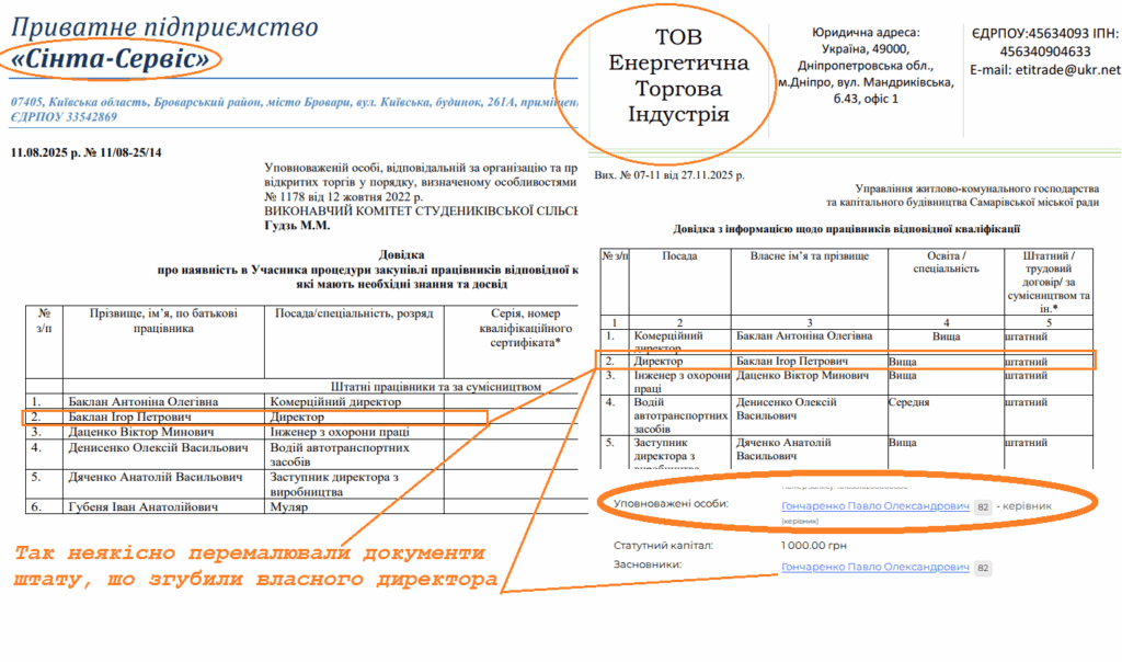 Наприклад “Енергетична торгова індустрія” подає документи по штату. Мало того, що вони вказують не двох (як у реєстрах) працівників, а більше десяти, так у штаті навіть немає нинішнього директора, там якийсь інший тип. Насправді – цей документ є обрізаним документом ПП “Сінта-Сервіс”, з яким ті ходять на торги. Просто обрізали та підмінили бланк.