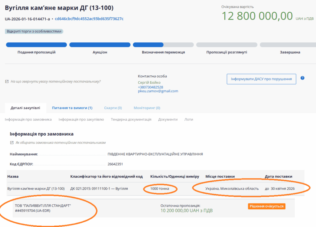24 січня ПІВДЕННЕ КВАРТИРНО-ЕКСПЛУАТАЦІЙНЕ УПРАВЛІННЯ провело закупівлю на вугілля кам’яне марки ДГ (13-100) за 12 800 000 гривень. 1000 тонн хочуть отримати до 30 квітня.