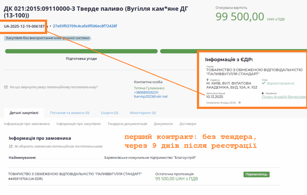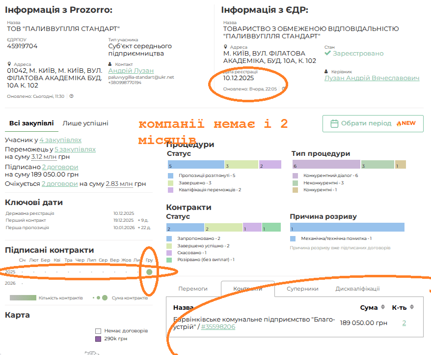 А далі починається цікаве. ТОВ “ПАЛИВВУГІЛЛЯ СТАНДАРТ” з’явилось на світ 10 грудня 2025 року (ще немає 2 місяців).