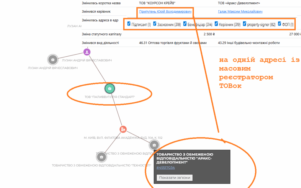 На одній адресі з новоспеченим переможцем (у кімнаті 102) знаходиться ще дві компанії. Одна з них називається ТОВ “АРАКС-ДЕВЕЛОПМЕНТ”. Створена вона була два роки тому за іншою назвою з метою продавати фрукти та овочі. нещодавно передумала і вирішила, що буде будівельником будівель. А створював її Юрій Припутень – один з найвідоміших створювачів компаній-оболонок. Траплявся нам не один раз.