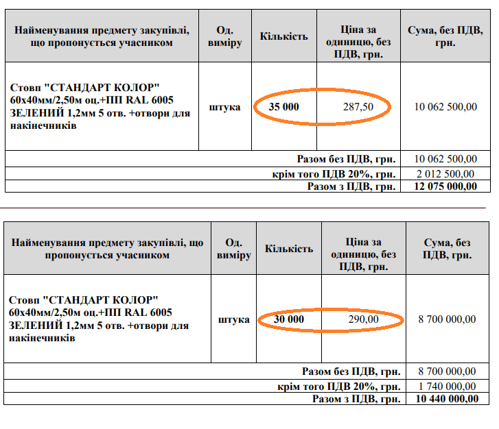 А 31 липня вирішили придбати ще 35 000 стовпів за 13 104 000 гривень. Тут також переміг ТОВ “Сітка Захід Україна” з пропозицією у 10 533 600 гривень, обійшовши трьох інших учасників.