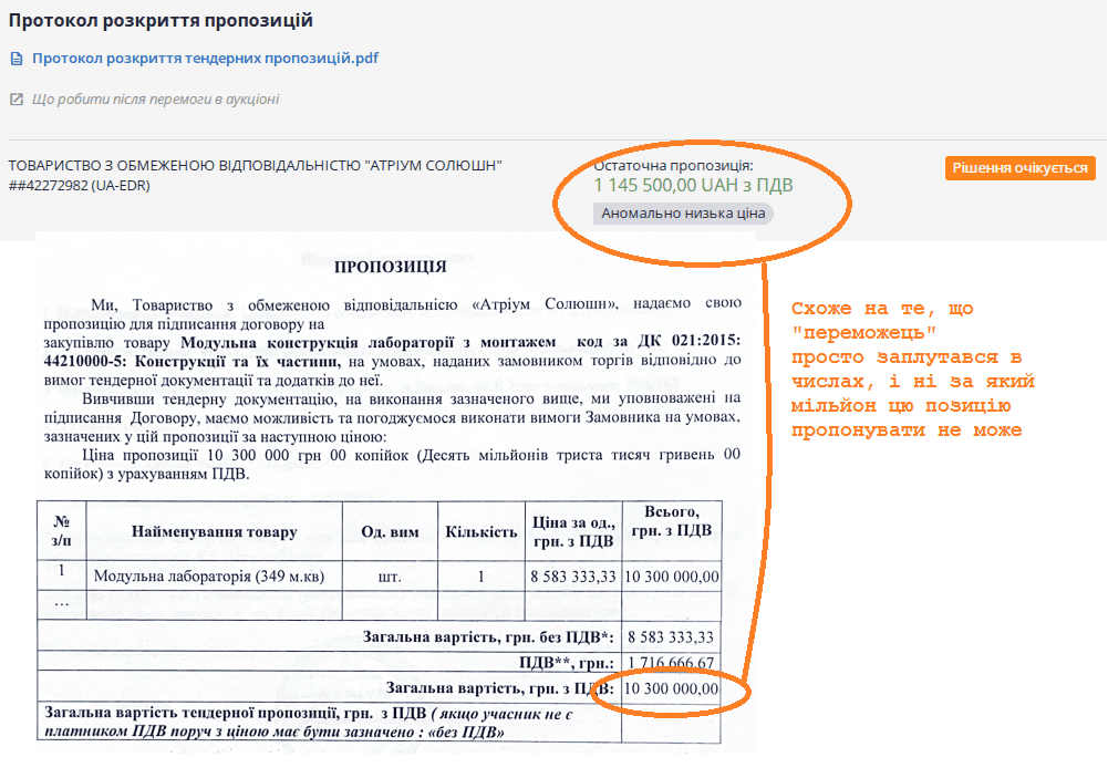 На торгах перемагає учасник, ТОВ “АТРІУМ СОЛЮШН” з пропозицією у 1 145 500 гривень. Так, ми на цьому місці теж попирхнулись, бо конкурент давав пропозицію у 9 780 000 гривень.