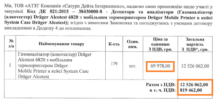 5 вересня Державна установа “Центр обслуговування підрозділів Національної поліції України” провела закупівлю на газоаналізатори (алкотестер) Dräger Alcotest 6820 з мобільним термопринтером Dräger Mobile Printer в кейсі System Case Dräger Alcotest.