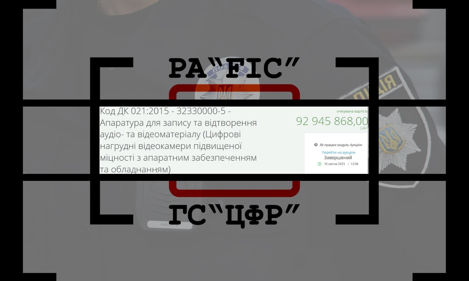 16 квітня Державна установа “Центр обслуговування підрозділів Національної поліції України” провела закупівлю на цифрові нагрудні відеокамери підвищеної міцності з апаратним забезпеченням та обладнанням. Очікувана вартість закупівлі склала 92 945 868 гривень.