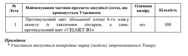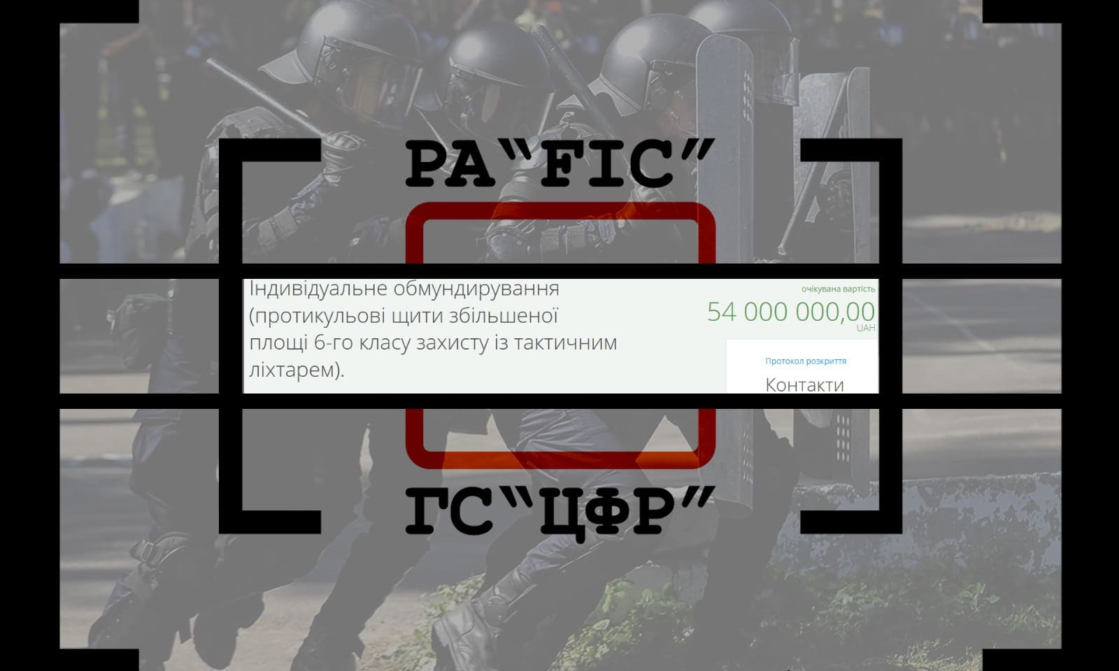 13 жовтня Національна поліція України провела закупівлю на протикульові щити збільшеної площі 6-го класу захисту із тактичним ліхтарем, очікуваною вартістю у 54 000 000 гривень.