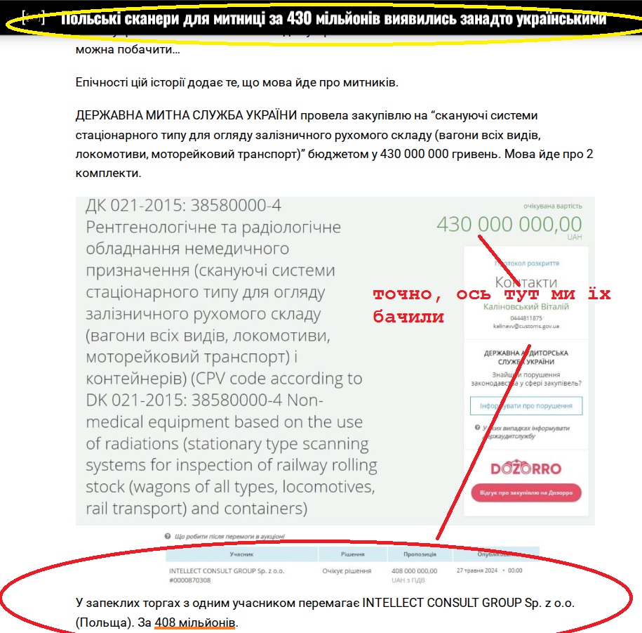 За цією компанією ми давно слідкуємо. Декілька років поспіль контора намагалась пропхати митникам китайський сканер за 430 мільйонів. Але схема була на стільки крива, а журналісти так часто писали про ці торги, що довелось змиритись і відмовитись.