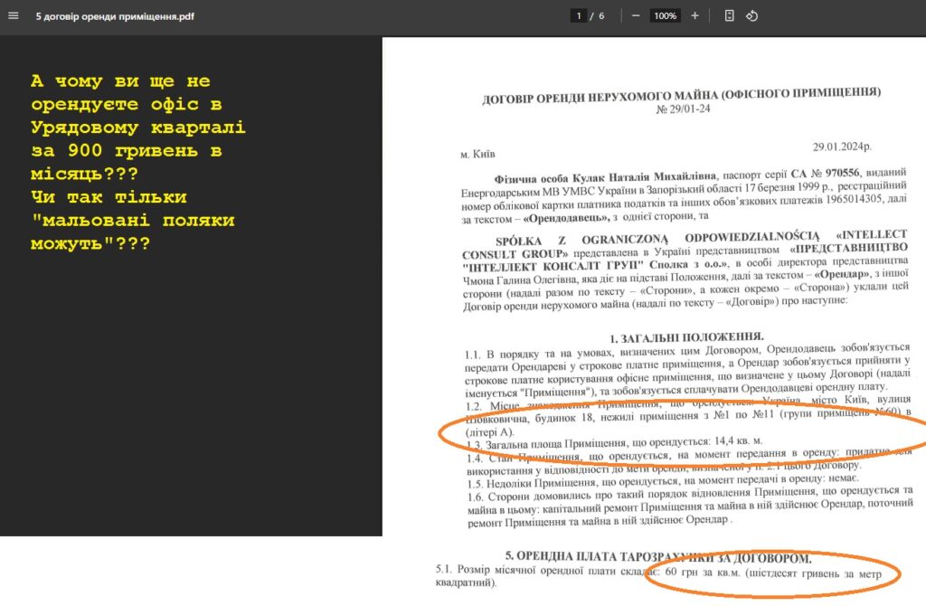 Кажуть, що орендують офісне на вул. Шовковична 18… за 864 гривні в місяць (14, 4 м.кв по 60 гривень за квадрат). Ага, ну звісно ж, в урядовому кварталі всі офіси стільки і коштують. В Кулак Наталії Михайлівни – керівниці компанії з такою ж назвою, що і в поляків: ТОВ “ІНТЕЛЕКТ КОНСАЛТ ГРУП”(код ЄДРПОУ 36589234).