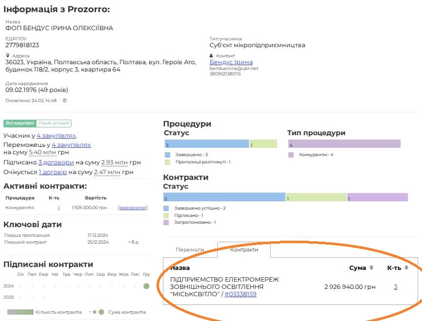 ФОП зареєстрований 28 листопада 2024 року. Вже має 3 договори на 2,9 мільйона гривень. Співпрацює виключно з одним, вище згаданим, учасником.