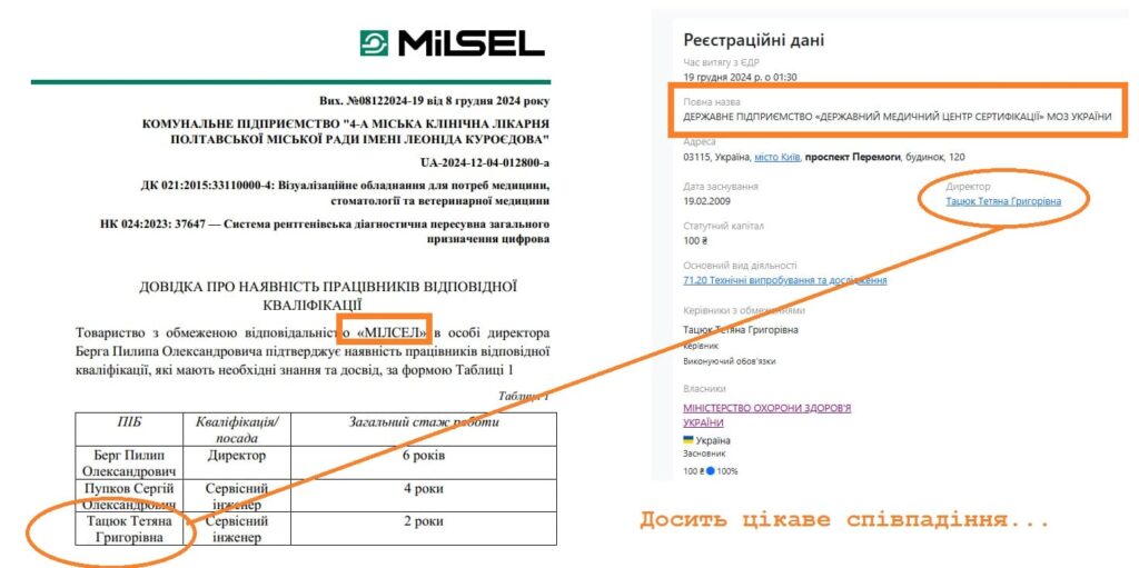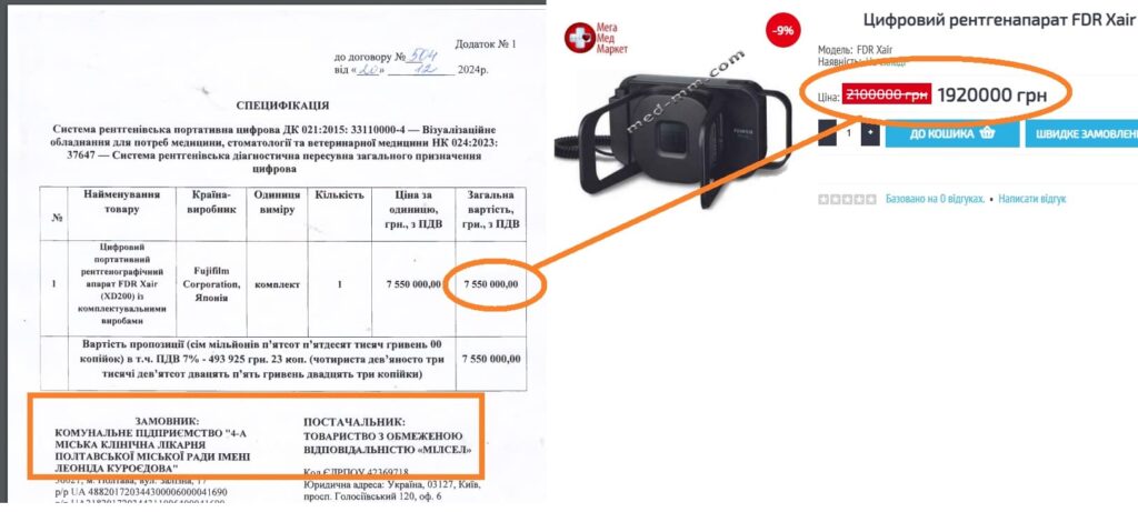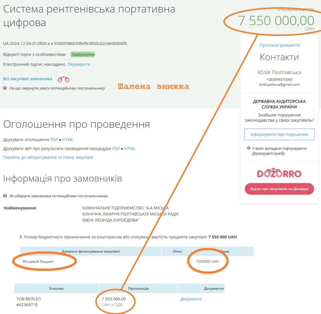 Виявилось, що ще 12 грудня КОМУНАЛЬНЕ ПІДПРИЄМСТВО “4-А МІСЬКА КЛІНІЧНА ЛІКАРНЯ ПОЛТАВСЬКОЇ МІСЬКОЇ РАДИ ІМЕНІ ЛЕОНІДА КУРОЄДОВА” провело закупівлю на портативну рентгенівську систему за 7 550 000 гривень. Кошти на неї виділили з місцевого бюджету. На торгах, без спроби торгу, переміг ТОВ “МІЛСЕЛ”. Доставити збирались через два тижні (до кінця бюджетного року).