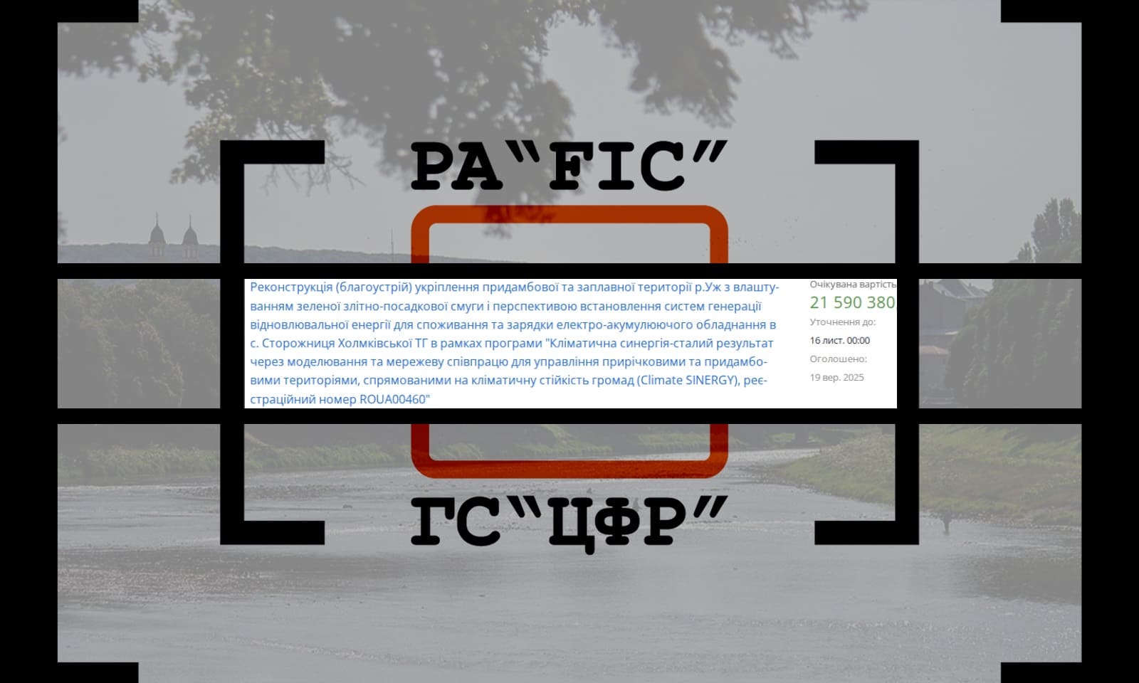 19 листопада Холмківська сільська рада Ужгородського району Закарпатської області провела закупівлю на реконструкцію (благоустрій) укріплення придамбової та заплавної території р.Уж з влаштуванням зеленої злітно-посадкової смуги і перспективою встановлення систем генерації відновлювальної енергії для споживання та зарядки електро-акумулюючого обладнання в с. Сторожниця Холмківської ТГ в рамках програми “Кліматична синергія-сталий результат через моделювання та мережеву співпрацю для управління прирічковими та придамбовими територіями, спрямованими на кліматичну стійкість громад (Climate SINERGY), реєстраційний номер ROUA00460”.