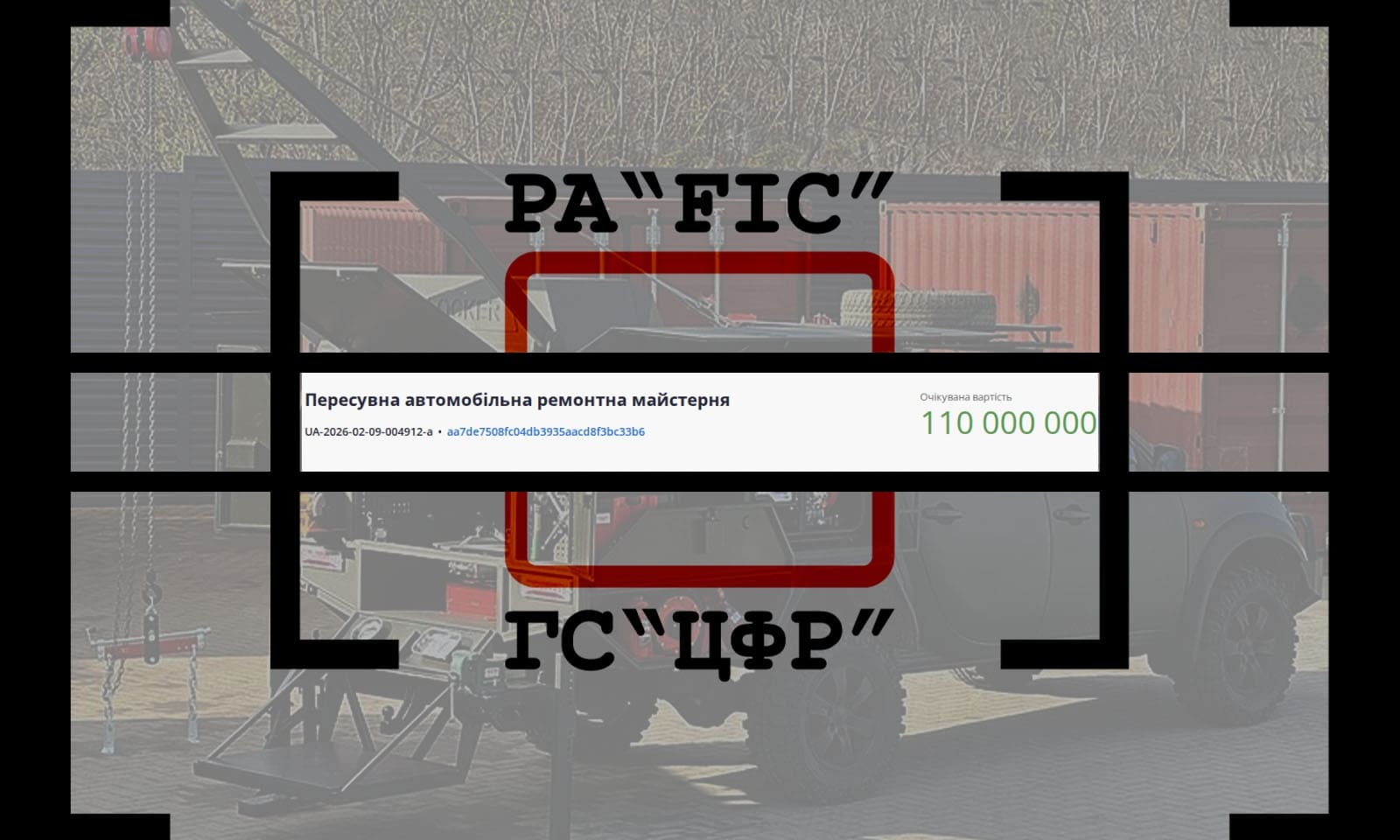 20 лютого ГОЛОВНИЙ ЦЕНТР КАПІТАЛЬНОГО БУДІВНИЦТВА, РЕКОНСТРУКЦІЇ ТА ЗАКУПІВЕЛЬ ДЕРЖАВНОЇ ПРИКОРДОННОЇ СЛУЖБИ УКРАЇНИ провів закупівлю на пересувні автомобільні ремонтні майстерні.
