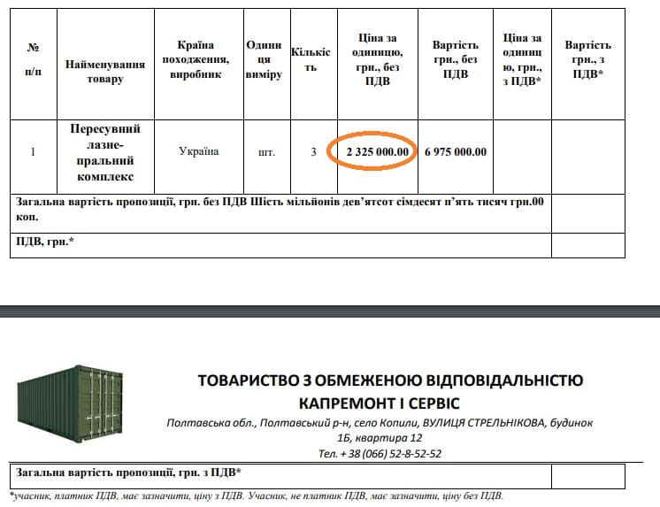 21 лютого ГОЛОВНИЙ ЦЕНТР КАПІТАЛЬНОГО БУДІВНИЦТВА, РЕКОНСТРУКЦІЇ ТА ЗАКУПІВЕЛЬ ДЕРЖАВНОЇ ПРИКОРДОННОЇ СЛУЖБИ УКРАЇНИ провів закупівлю на три пересувних лазне-пральних комплекси. Очікувана вартість закупівлі склала 8 402 400 гривень.