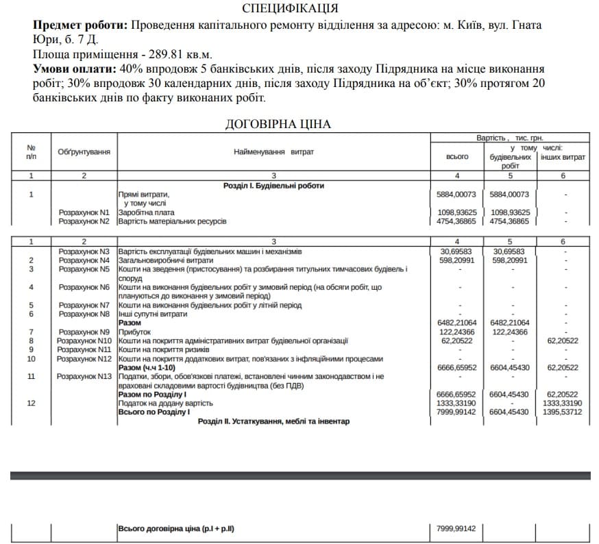 30 грудня АКЦІОНЕРНЕ ТОВАРИСТВО КОМЕРЦІЙНИЙ БАНК “ПРИВАТБАНК” опублікувало закупівлю на проведення капітального ремонту відділення та виготовлення броньованої касової кабіни за адресою м. Київ, вул Гната Юри, б. 7Д. Вартість ремонту становить 7 999 991,42 гривні. Контракт без проведення відкритих торгів отримав ТОВ “АРКА – СТРОЙ”.