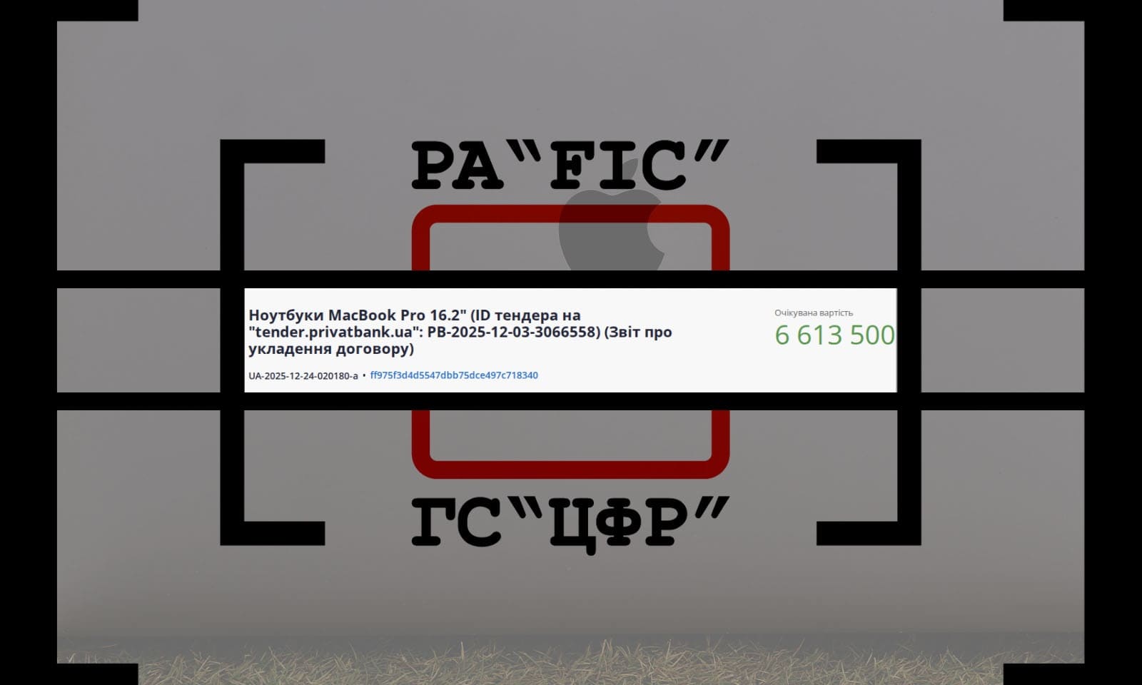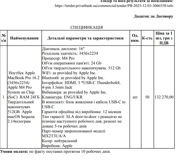 24 грудня АКЦІОНЕРНЕ ТОВАРИСТВО КОМЕРЦІЙНИЙ БАНК “ПРИВАТБАНК” провело закупівлю без відкритих торгів на ноутбуки MacBook Pro 16.2.