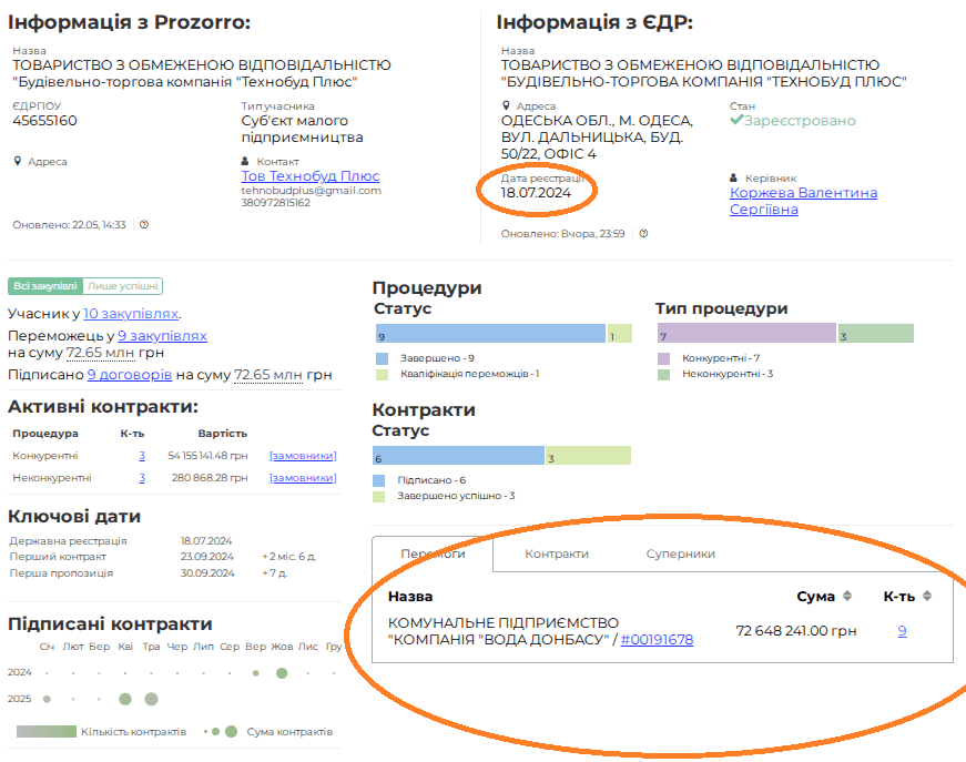ТОВ, що створений у 2024 році має вже 9 договорів на 72 мільйони. Працює виключно з одним єдиним замовником. Є пов’язаною з цим замовником компанією.