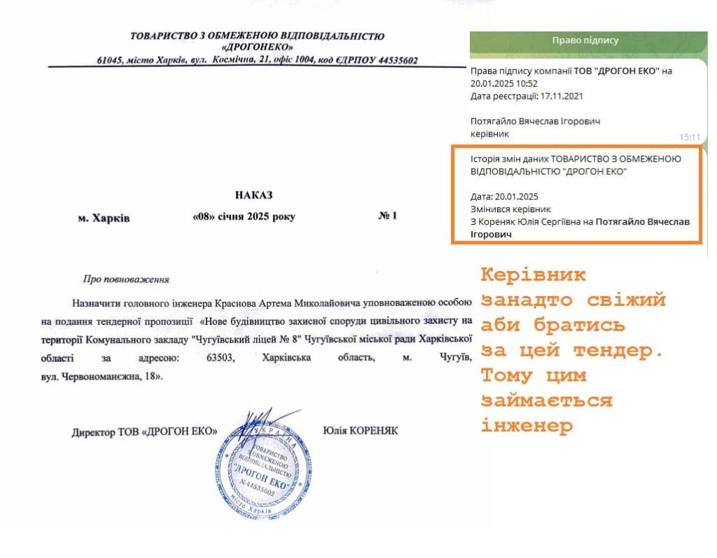 Дивно, що всі документи на тендер підписує головний інженер Артем Краснов, на що його вповноважила директорка Юлія Кореняк 8 січня 2025 року. А два дні тому у ТОВа змінився директор.