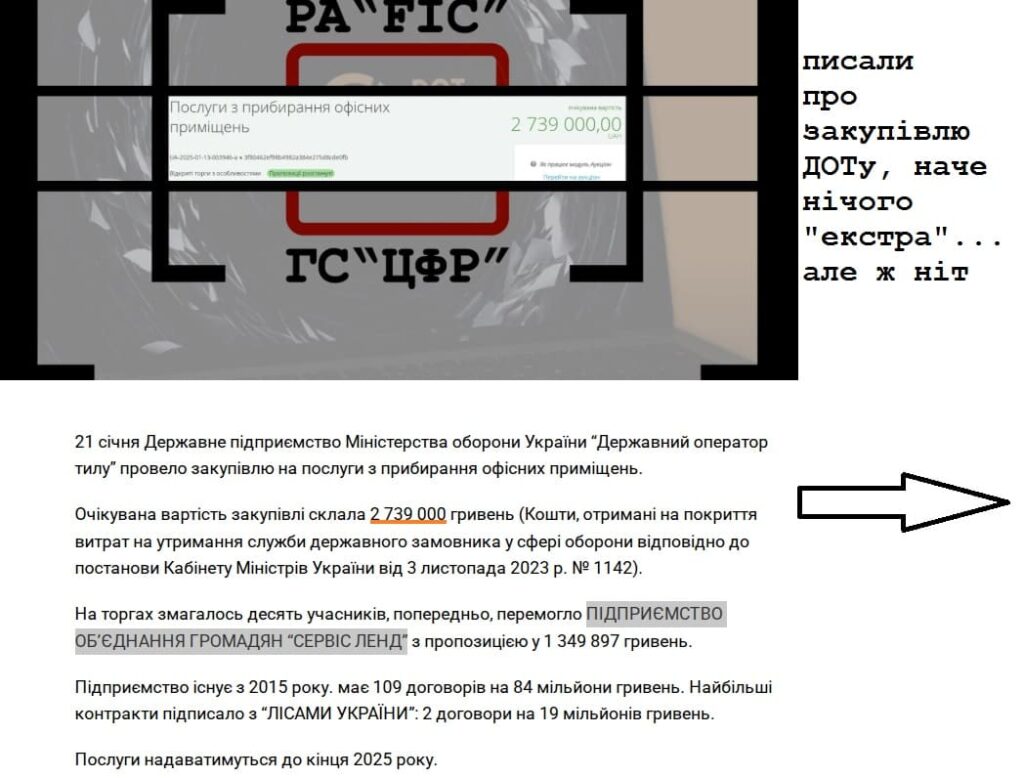 На минулому тижні Державний оператор тилу провів закупівлю на прибирання офісів бюджетом у 2 739 000 гривень (про що ми згадували у щотижневому дайджесті). Фінальна ціна 1,3 нічого особливого. Більше того, ДОТ прибиратиме свої офіси значно дешевше БЕБа, підрозділів ДПС чи Центрів зайнятості (тим взагалі дах знесло – на 70 мільйонів оголосили торгів).