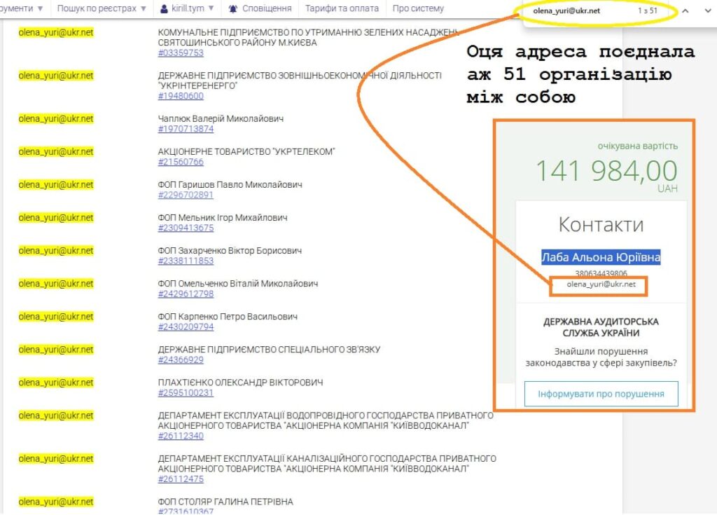 Взагалі, olena_yuri@ukr.net – це така адреса, за якою пов’язані між собою аж 51 організація. Адреса, до речі, належить головній закупівельниці Святошинської райдержадміністрації. Можливо, система десь дала збій… але не у 51 випадку: для збігу потрібно, щоб цю адресу десь хоч раз вказав учасник.