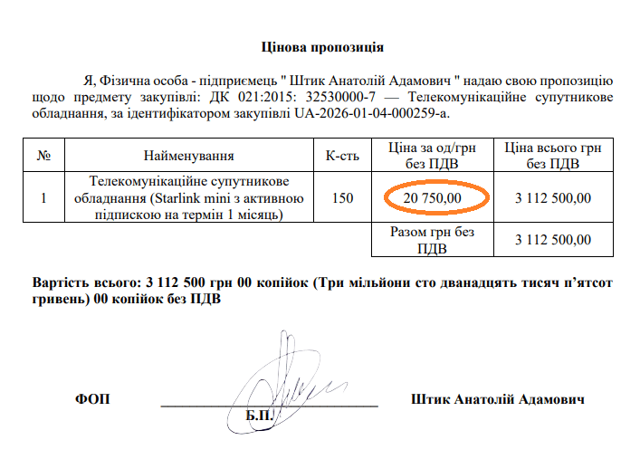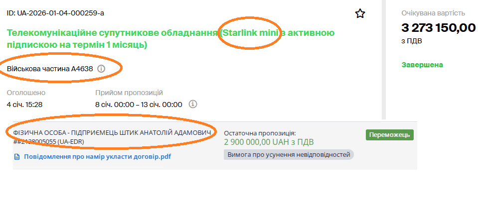 13 січня Військова частина А4638 провела закупівлю на Starlink mini з активною підпискою на термін 1 місяць, очікуваною вартістю у 3 273 150 гривень.