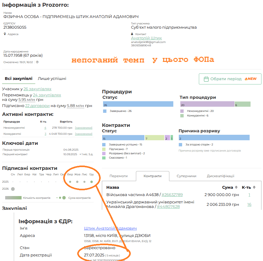 Пану 67 років, має 22 договори на 5 мільйонів. Безперервно вигравати тендери почав з вересня 2025-го, за два місяці після реєстрації (інформація з порталу Clarity Project).