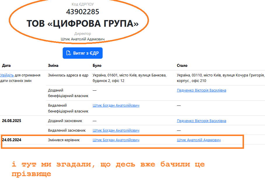 До цього, у 2024 році, Штик Анатолій Адамович стає керівником ТОВУ “ЦИФРОВА ГРУПА” (замість Штика Богдана Анатолійовича). В серпні 2025-го ТОВка переїздить на іншу адресу з вул. Банкова 2.
