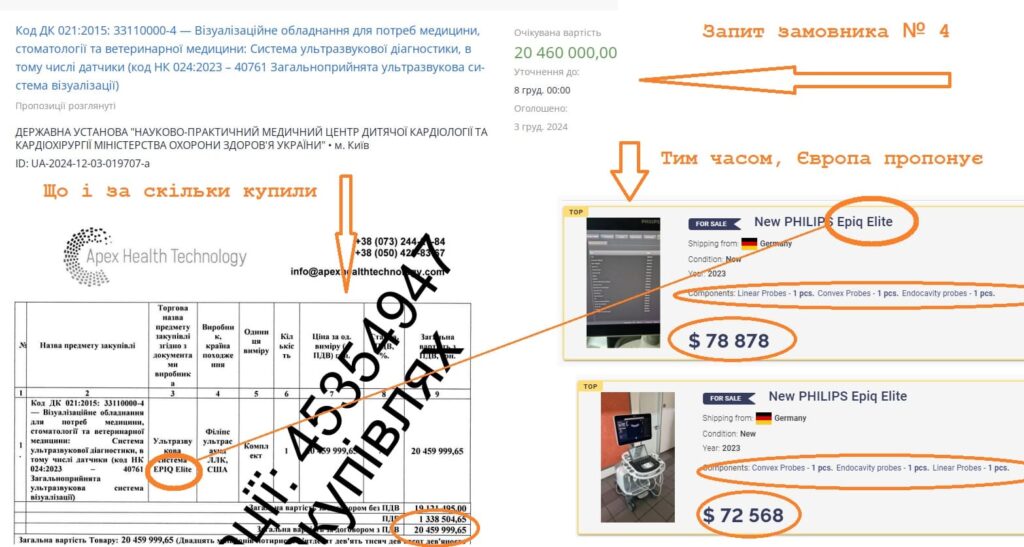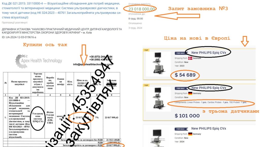 За 23 мільйони купують… один УЗД-апарат за у ТОВу “АПЕКС ХЕЛС ТЕХНОЛОДЖИ”. ТОВ пропонує модель Epiq CVx (американець). В Європі такий новий пропонують приблизно за 55 000 доларів або… за +/- 3 мільйони гривень. А шикарний новий такий апарат з трьома датчиками пропонують за 101 тисячу доларів, або за 4,2 мільйона гривень. Замовник просить 6 датчиків до УЗД… але це точно не буде коштувати 23 017 999,43 гривні.