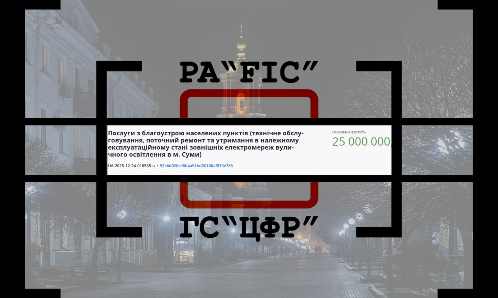 5 січня Департамент інфраструктури міста Сумської міської ради провів закупівлю на послуги з благоустрою населених пунктів (технічне обслуговування, поточний ремонт та утримання в належному експлуатаційному стані зовнішніх електромереж вуличного освітлення в м. Суми).