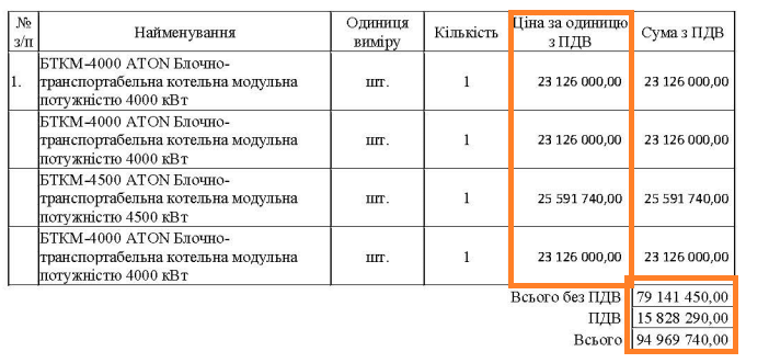 У першому лоті закуповували чотири котельні. Тут переможцем став ТОВ “АТОНМАШ” з пропозицією у 94 969 740 гривень.