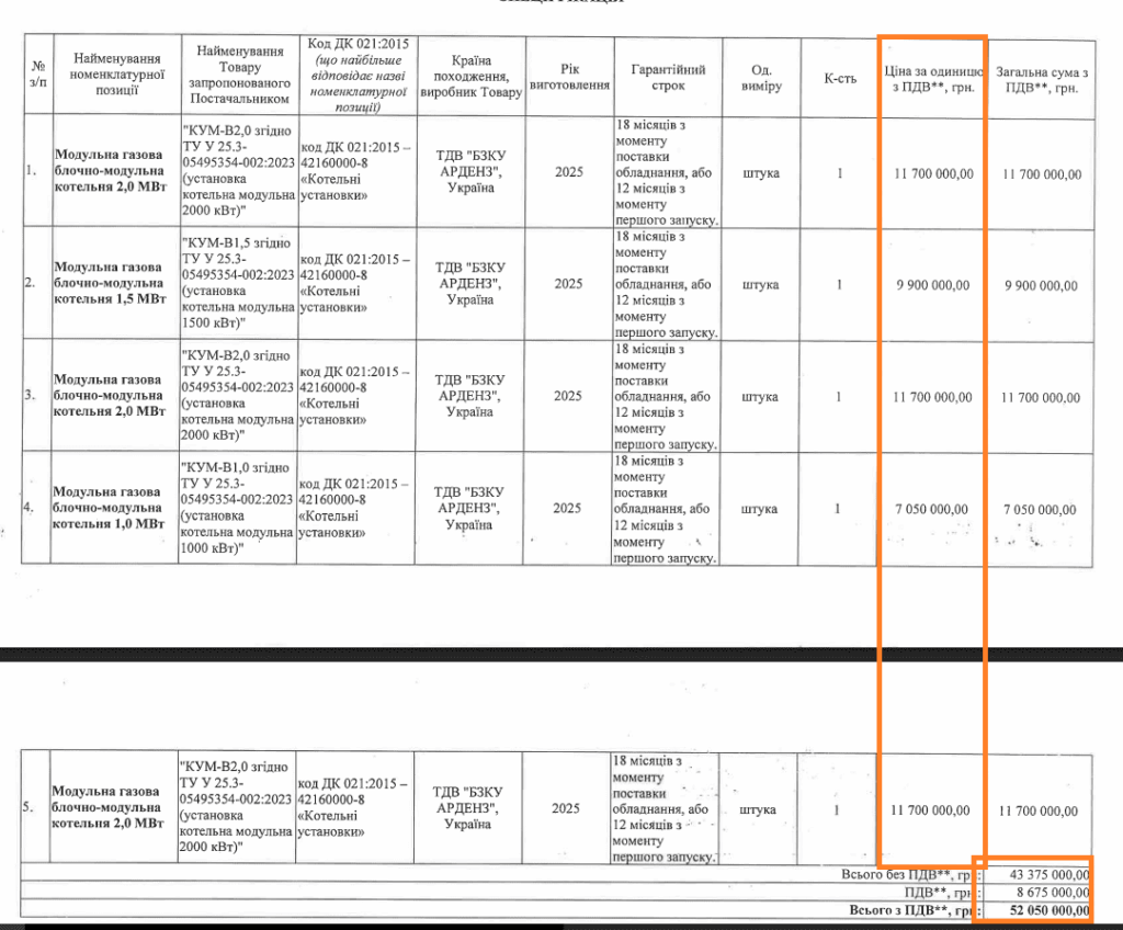 Переможцем у другому лоті на п’ять котелень став ТДВ ” “БРОВАРСЬКИЙ ЗАВОД КОТЕЛЬНОГО УСТАТКУВАННЯ АРДЕНЗ”” з пропозицією у 52 050 000 гривень.