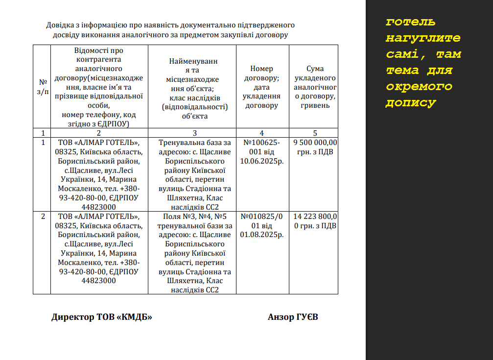 Ну, так собі досягнення за 9 років, якось не тягне на контракт за 38 мільйонів. Звісно, ТОВ прийшов з іншим досвідом. Говорить, що у 2025 році двічі ремонтував тренувальну базу у с. Щасливе на замовлення ТОВ “АЛМАР ГОТЕЛЬ”. Саме там зараз тренується ФК “Шахтар”. Добре, хай буде.