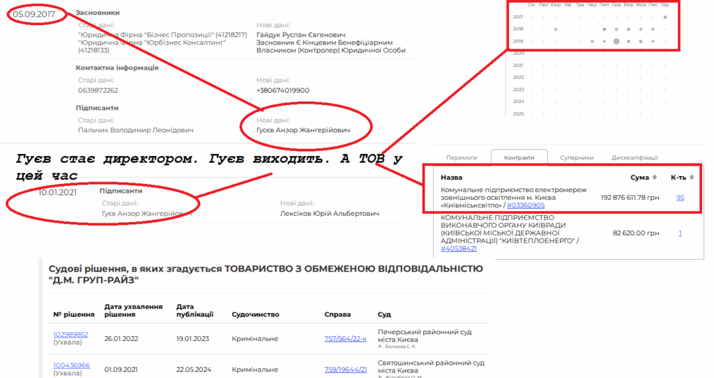 Так от за період директорування на ТОВці “Райз” Гуєв бере 97 контрактів на 192 мільйонів (період 2017-2019 роки) від “Київміськсвітла”. Якось так щастило, що КП у них цілими блоками замовляли ремонт мереж зовнішнього освітлення. А потім, у 2020 році припинили. А у 2021 році Гуєв виходить з директорів, лишаючи по собі кримінальні по ч.5 ст 191 ККУ.