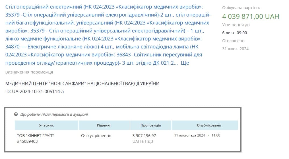 Так от, в понеділок, 11 листопада, МЕДИЧНИЙ ЦЕНТР “НОВІ САНЖАРИ” НАЦІОНАЛЬНОЇ ГВАРДІЇ УКРАЇНИ провів закупівлю бюджетом у 4 039 871 гривню на медичне обладнання: три операційних столи, 4 ліжка та 3 лампи.