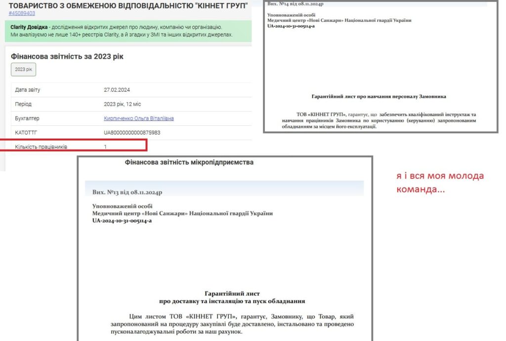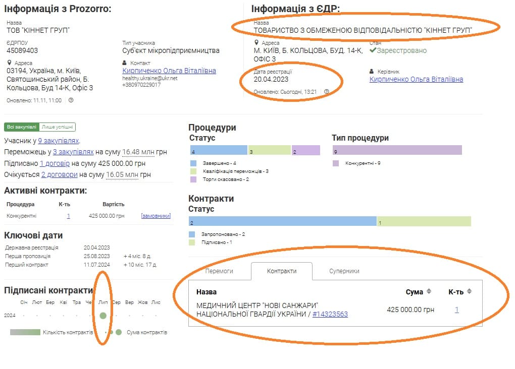 На торгах перемагає “свіжачок” – ТОВ “КІННЕТ ГРУП”. ТОВ зареєстрований у 2023 році. Має один контракт (з вище згаданим замовником) на автоматизоване робоче місце лікаря.