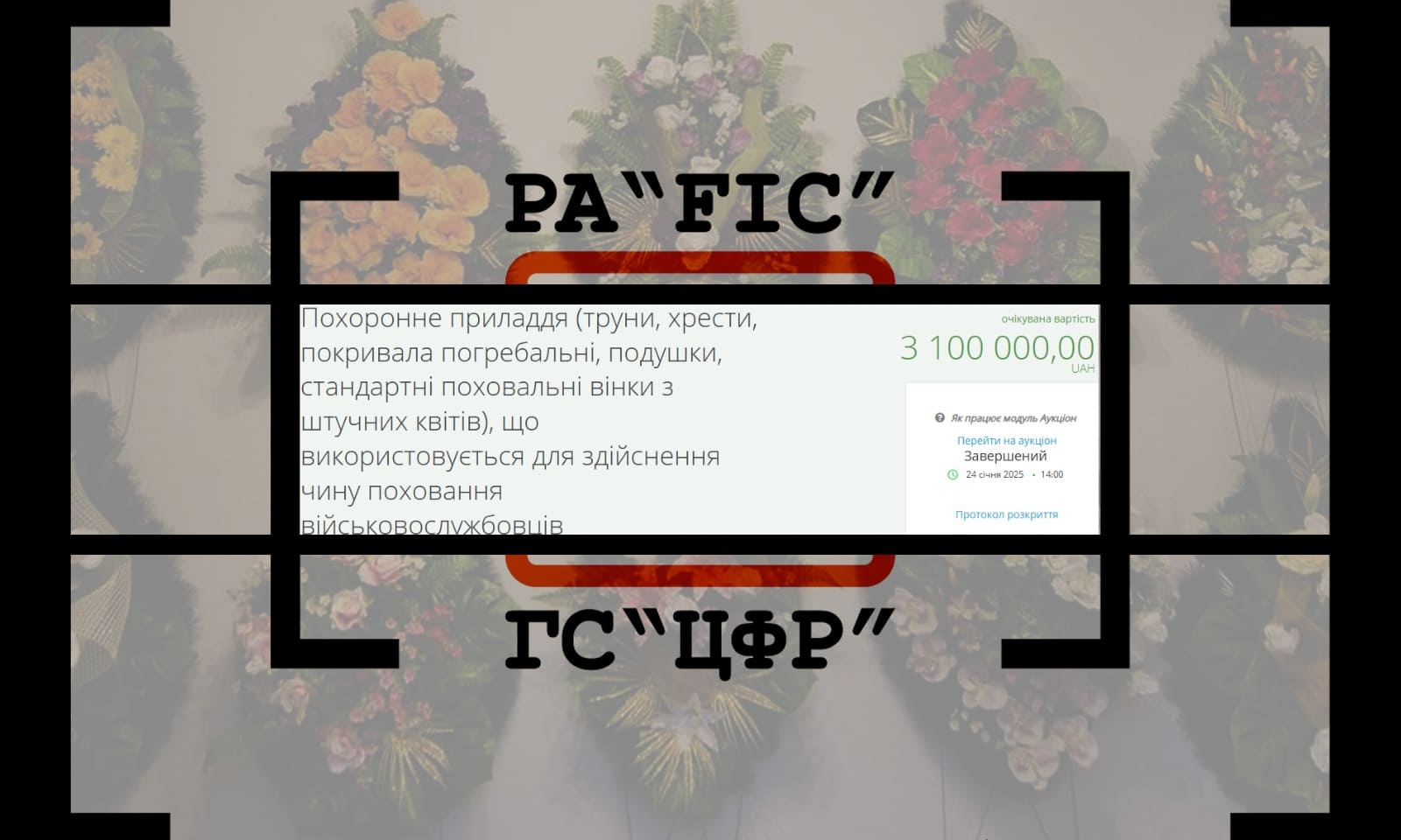 Цей же ФОП був відхилений на торгах замовника трьома днями раніше. Служба замовляла труни хрести, покривала погребальні, стандартні поховальні вінки з штучних квітів за 5 100 000 гривень. Перемогу здобув ФОП Крисовата Ірина Євгенівна з пропозицією у 4 916 100 гривень.