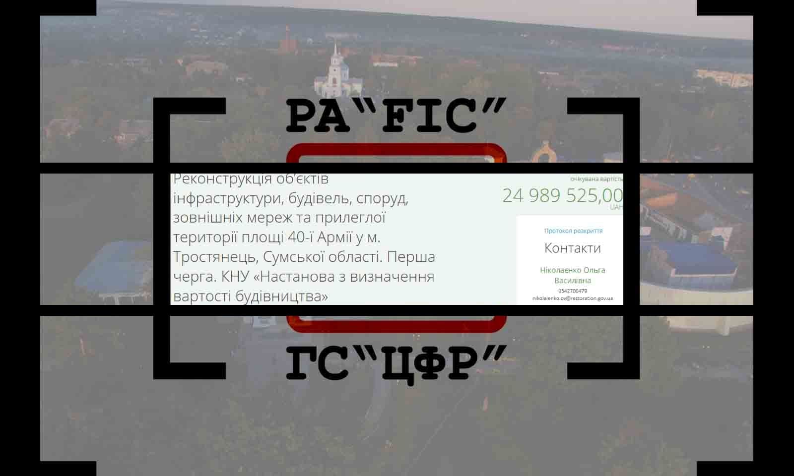 24 травня СЛУЖБА ВІДНОВЛЕННЯ ТА РОЗВИТКУ ІНФРАСТРУКТУРИ У СУМСЬКІЙ ОБЛАСТІ провела закупівлю на реконструкцію об’єктів інфраструктури, будівель, споруд, зовнішніх мереж та прилеглої території площі 40-ї Армії у м. Тростянець, Сумської області. Перша черга. Очікувана вартість закупівлі склала 24 989 525 гривень (державний бюджет).